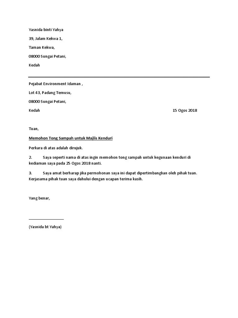 Contoh Surat Surat Permohonan Tong Sampah - Penukaran Tong Sampah Dalam Taman Perumahan Yang Telah Rosak Portal Rasmi Majlis Bandaraya Seremban Mbs. Contoh proposal pengajuan bantuan tempat sampah berbagi contoh proposal. Surat rasmi permohonan tong sampah in english, surat rasmi permohonan tong sampah dalam, surat rasmi permohonan tong sampah kartun, surat .