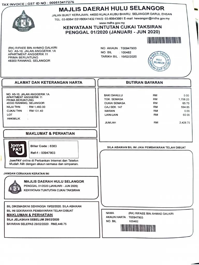 Jom jelaskan cukai taksiran (cukai pintu) majlis daerah hulu selangor (mdhs) bagi penggal 1/2020 yang akan berakhir pada 29 februari 2020.